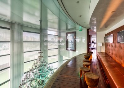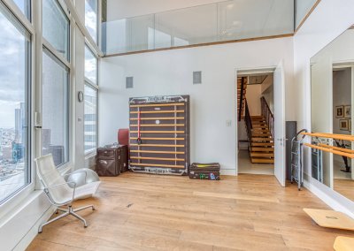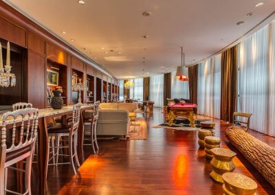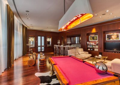 Walls are decorated with artworks and artistic screens. Master suite features an entire gallery. In the kitchen there is a beautiful spacious breakfast bar and an adjoined dining area facing the floor-to-ceiling windows; cleverly dividing public and private areas the designer also created his and her suites with dressing areas to make the mornings less noisy and stressful. This particular design shows that modern luxury penthouses are like mansions only for city-dwellers who don’t like to give up their exciting city lifestyle.