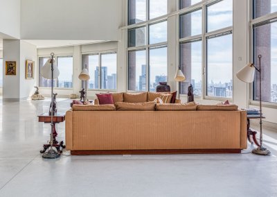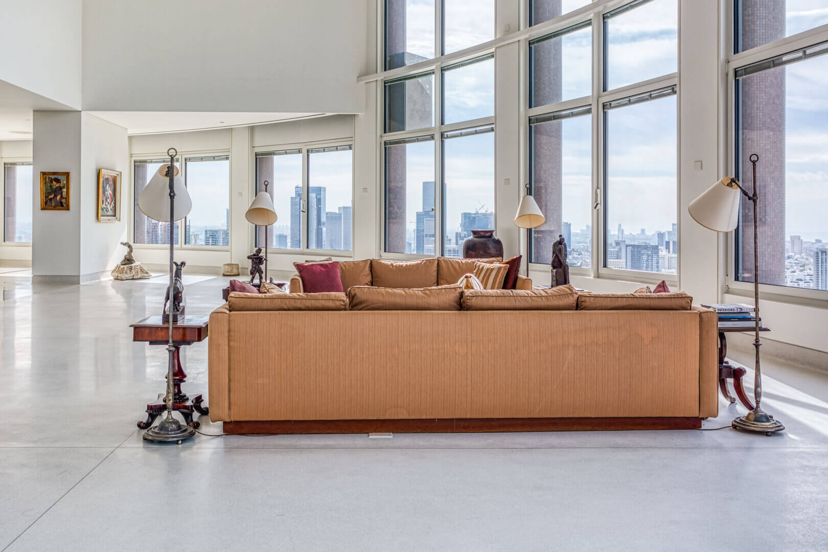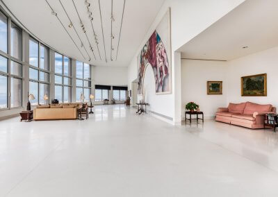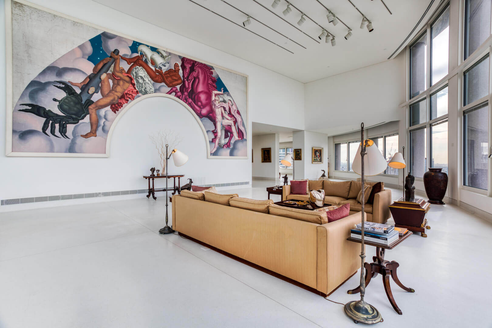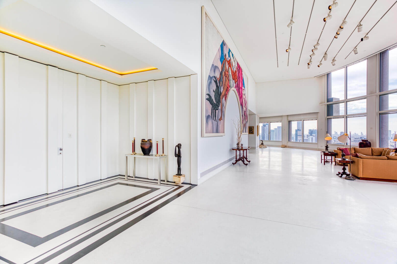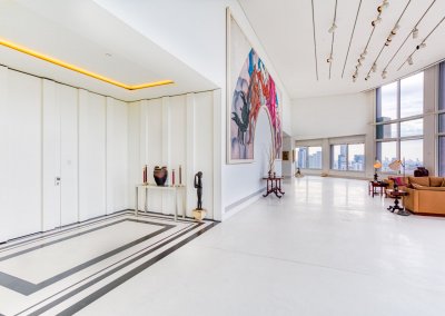 The apartment’s huge windows open up to the city views from the two-level living room. Built-in neon lights add colorful accents to the predominantly white interior. Each area has its own artwork or an entire array of sculptures. Even some of the lighting fixtures are sculptured.