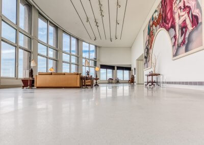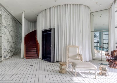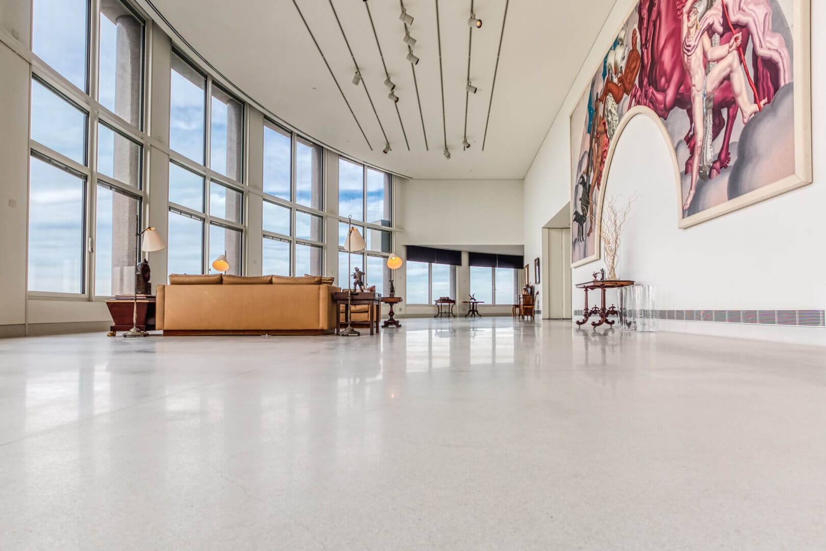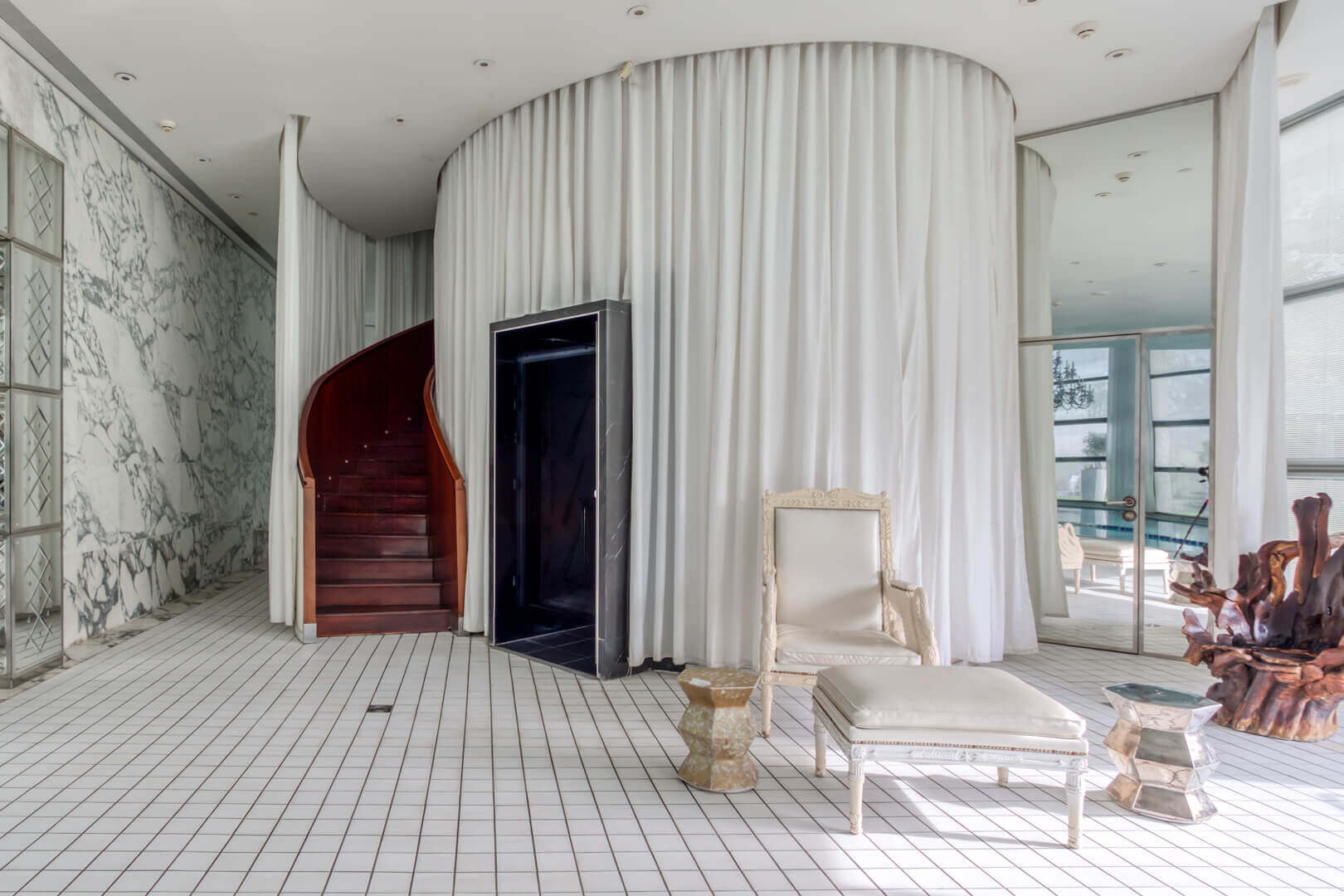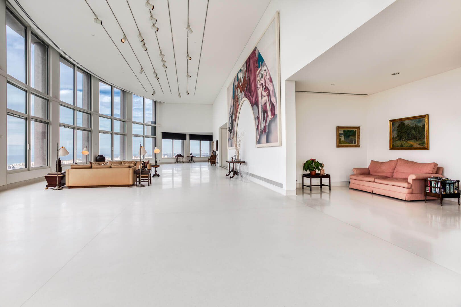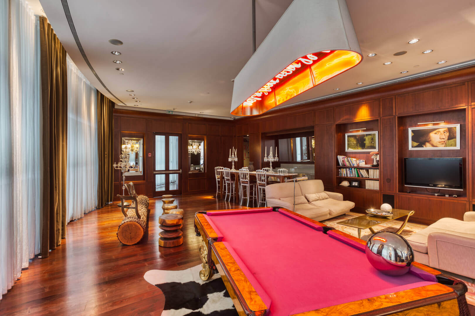 The apartment’s huge windows open up to the city views from the two-level living room. Built-in neon lights add colorful accents to the predominantly white interior. Each area has its own artwork or an entire array of sculptures. Even some of the lighting fixtures are sculptured.