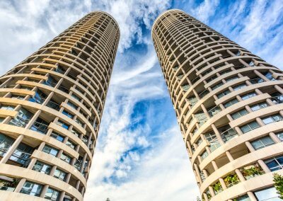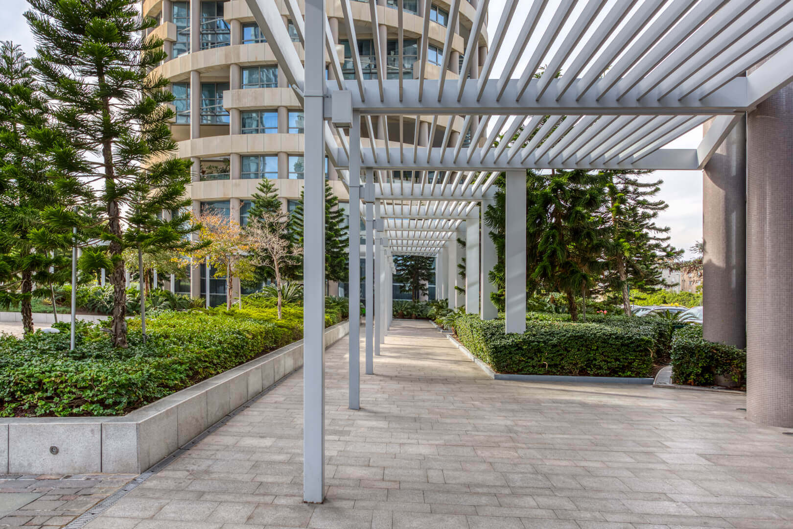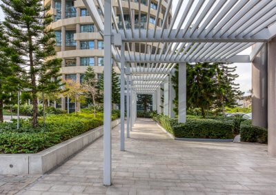 Park Tzameret located on the east-central side of the city. It comprises eleven luxurious tall apartment buildings, with one more under construction as of 2018, surrounded by green space. The 133 dunams (13.3 ha) area has been modeled upon similar projects in London and Paris. Only 18% of the area will contain buildings. Two squares will be built at the southern and northern sides of the neighborhood with a 60-metre-wide (200 ft) avenue linking them. Mature trees and vegetation will be planted along the avenue. In total, 1,747 apartments will be built in the neighborhood with 6,000 square metres (65,000 sq ft) of commercial and public buildings. The east and west boundaries of the area will be delineated by 4.5-metre-high (15 ft) acoustic barriers.